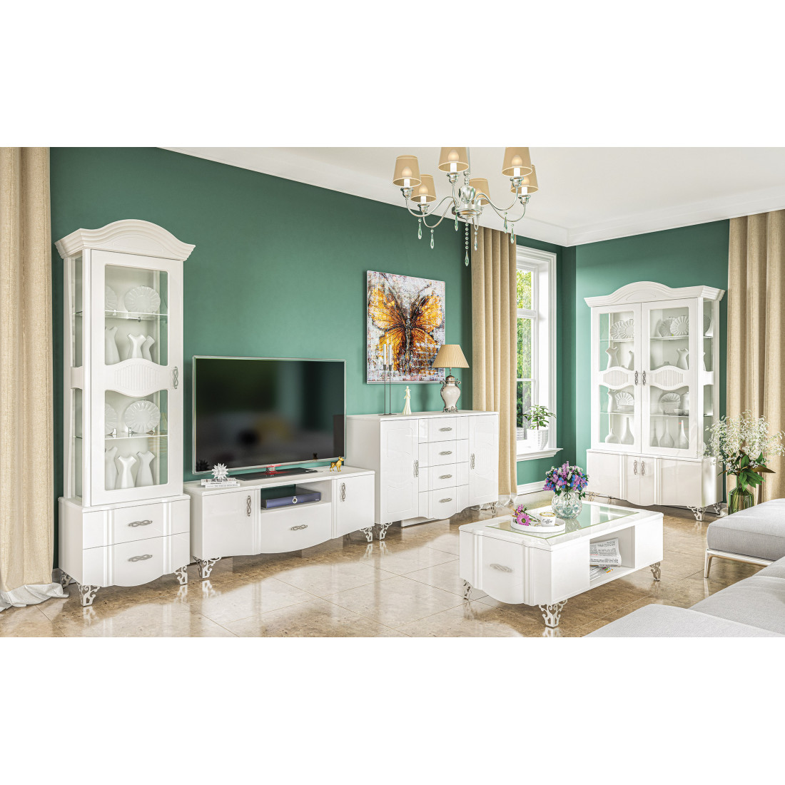 Известным белорусским производителем фабрикой Мебель-Неман гостиная София предлагается в виде модульной системы, состоящей из изящных шкафов-витрин, которые можно купить не только в качестве сервантов под декоративную посуду – остекление с трех сторон позволяет выставить на стеклянных полках коллекционные предметы, сувениры, кубки книги. Также в коллекцию входит центральная тумба под телевизор удлиненной формы, над которой по желанию можно подвесить открытые полки, и журнальный стол с практичными выдвижными ящиками. Купить элементы модульной стенки София от фабрики Мебель-Неман можно в произвольной комплектации.
