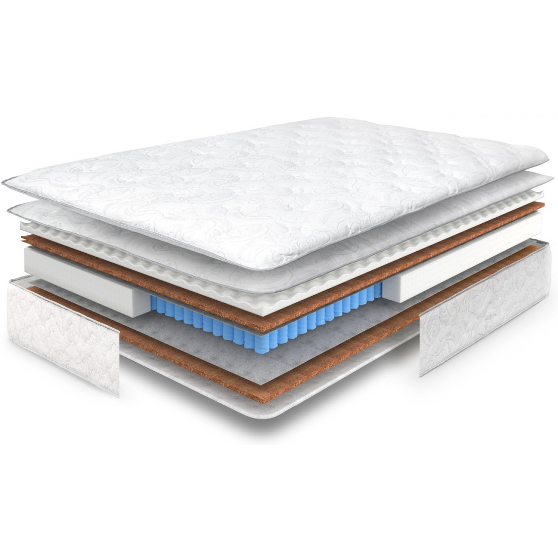Наполнение: пена с массажным эффектом, кокосовая койра 10/20 мм, спанбонд, блок независимых пружин, усиление матраса по периметру.