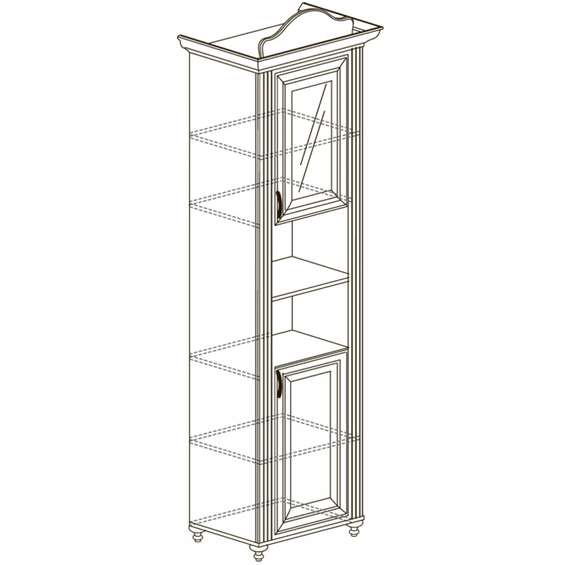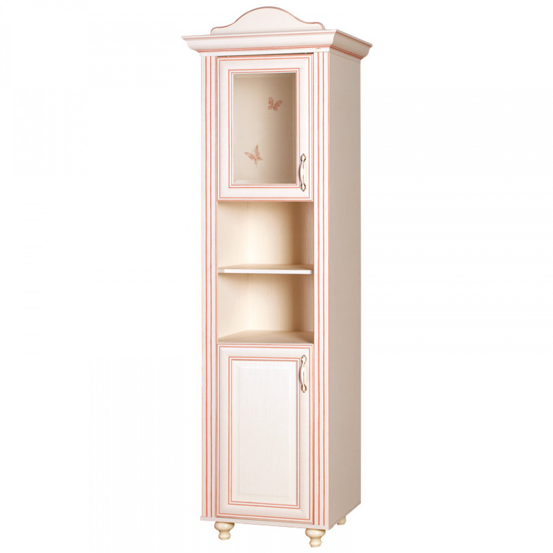 Фасады: МДФ, декор – кремовый белый, рисунок, патина, стекло с фацетом и рисунком