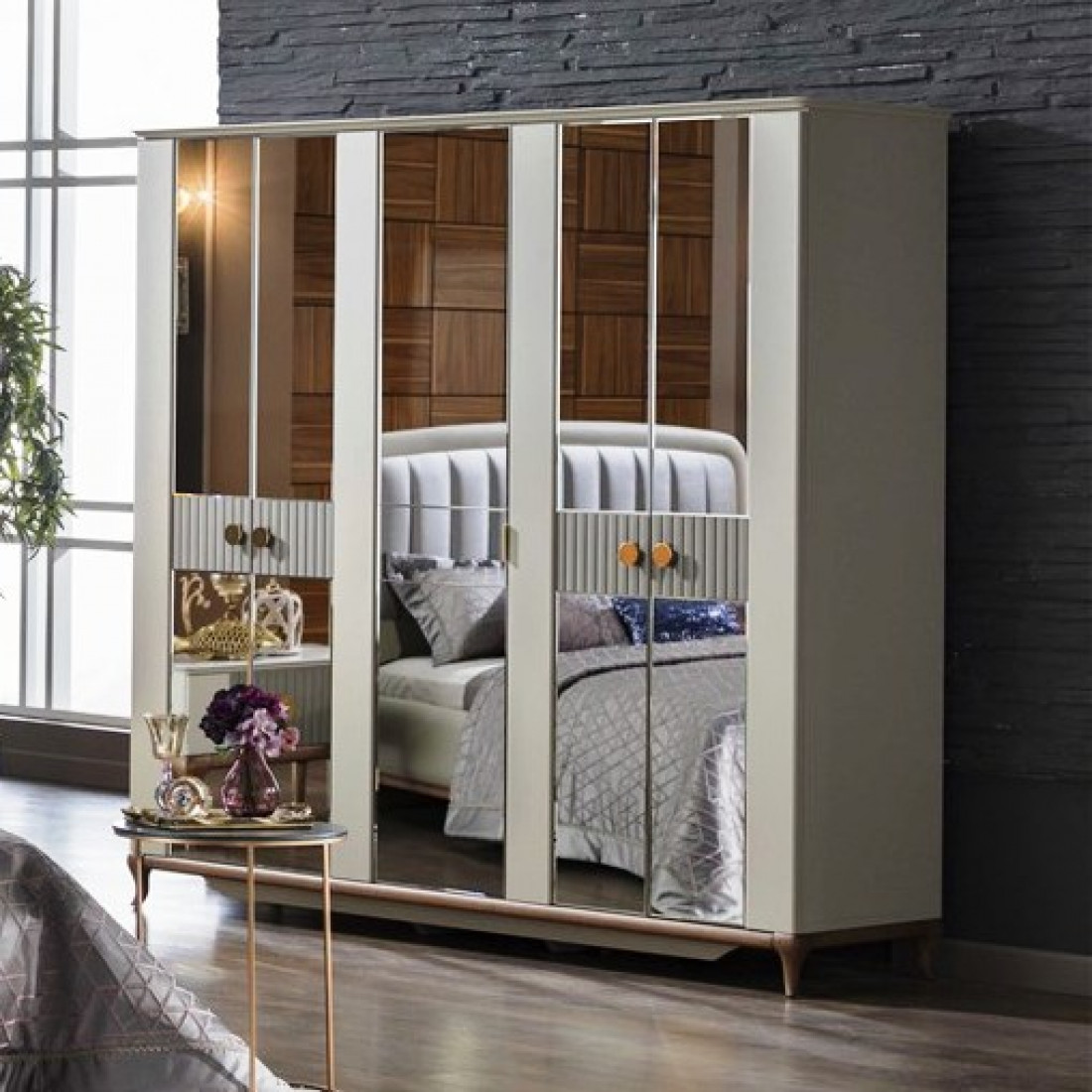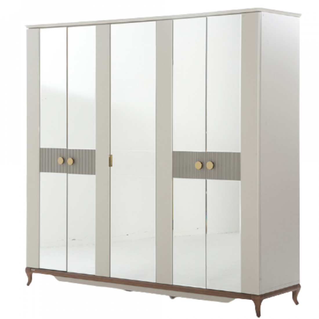 Шкаф платяной 5-дверный серии Pesaro Bellona. Изготовлен из высококачественного ЛДСП производства Турция, класс эмиссии формальдегидов Е1. Зеркальная дверь в центре с прямоугольной ручкой, двери справа и слева со вставками серого цвета и большими круглыми ручками под бронзу. Ножки и рамка из натурального дерева с оттенком медовый орех. Размеры и наполнение шкафа позволит аккуратно разместить большое количество вещей. Двери и ящики с доводчиками, обеспечивающими плавный ход и безопасность.