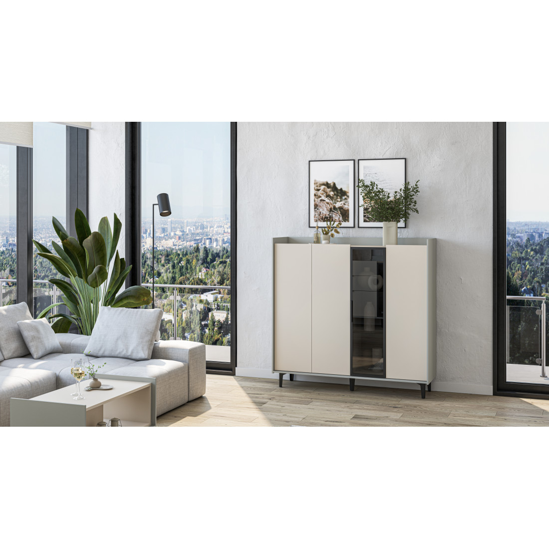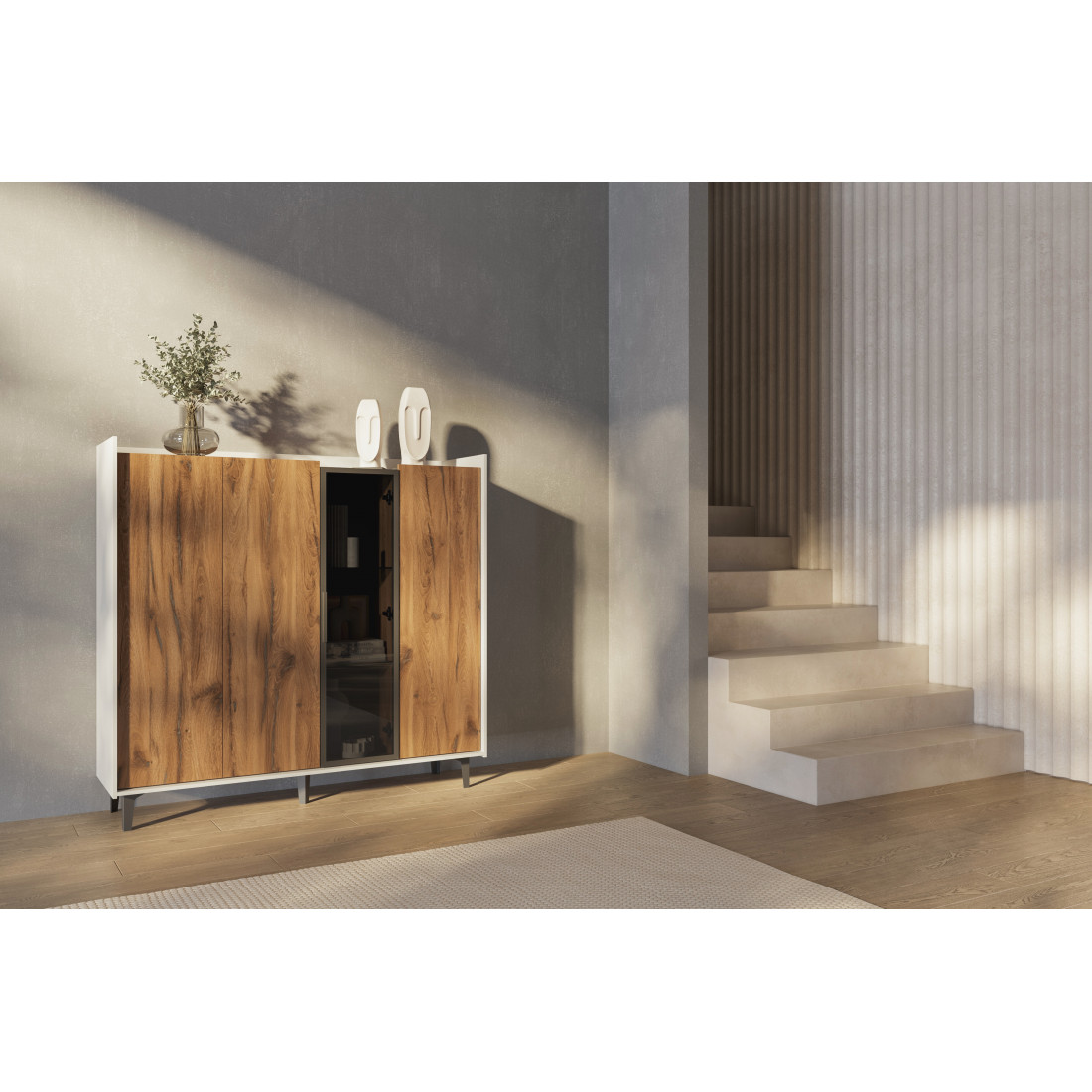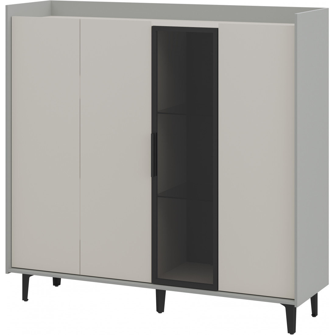 Элегантный шкаф Модена создает изысканную атмосферу в вашей гостиной. Предлагается в трех стильных вариантах цветов: Белый-Дуб Элисон, Лунный камень-жемчуг, Металл Бруклин-лунный жемчуг. Ножки из металла обеспечивают прочную поддержку. Темное стекло добавляет утонченности дизайну. Шкаф имеет три отделения с полками для удобного хранения, а также одно отделение со стеклянными полками и стеклянным фасадом, придающим ему элегантность. Идеальное решение для организации пространства в вашей гостиной