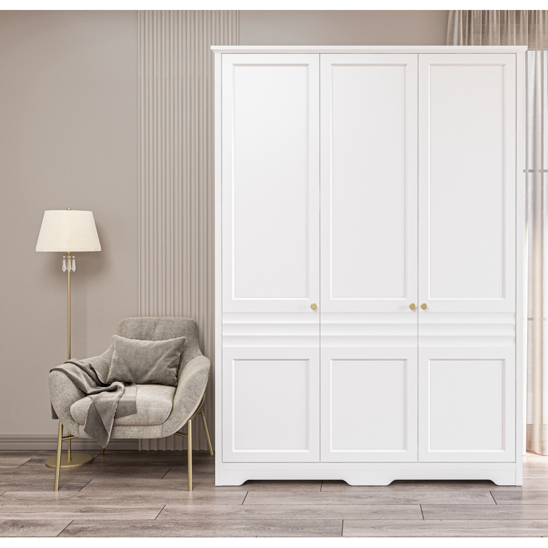 Денвер – это новая коллекция корпусной мебели для спальни, гостиной и столовой. Прямые строгие линии в сочетании с легкой горизонтальной волной на фасадах придают мебели элегантный и уверенный вид. Белый матовый цвет мебели, любимый многими за универсальность, можно сочетать с любым оттенком стен и пола. Округлые металлические золотые ручки разбавляют строгий и лаконичный вид фасадов и добавляют интерьеру утонченности.