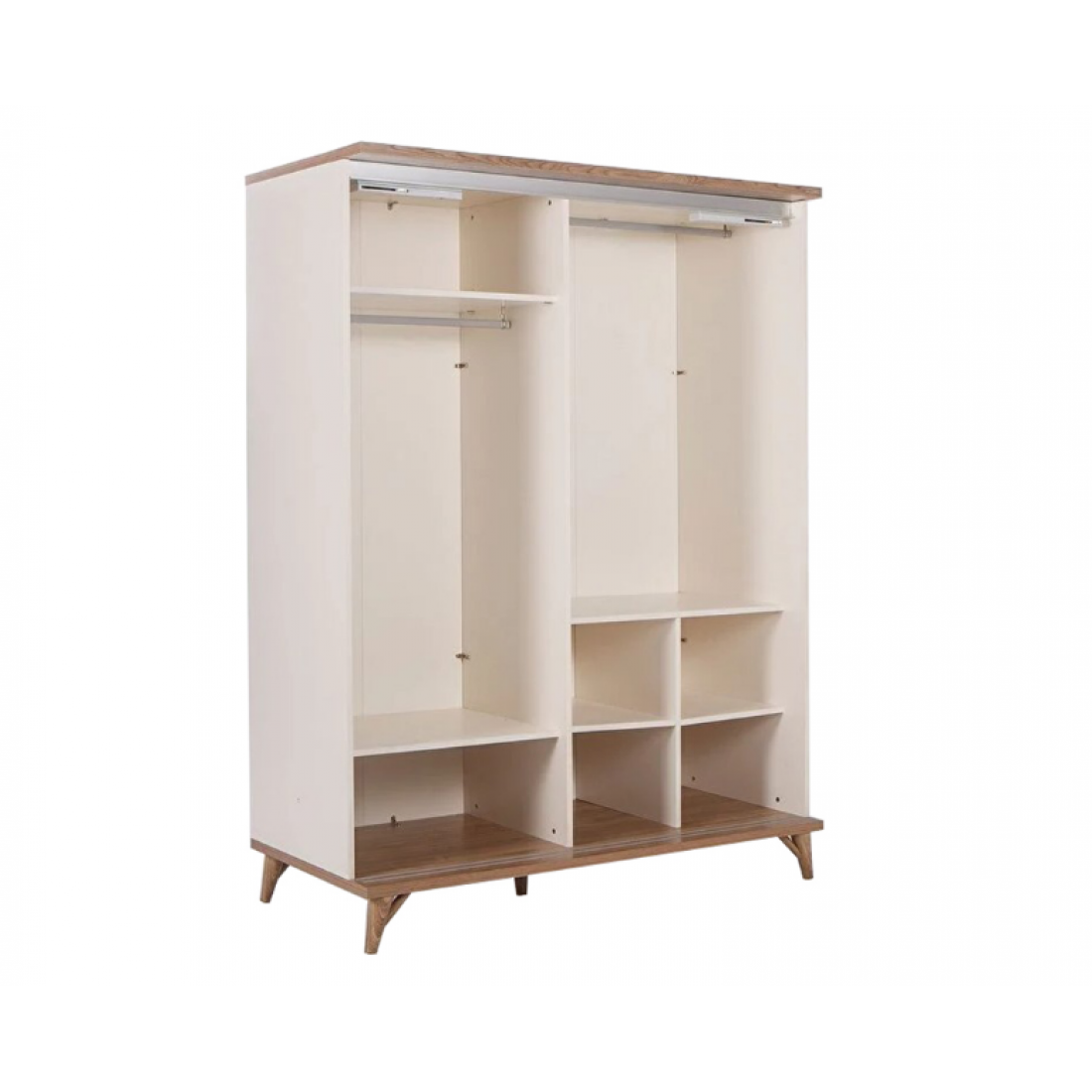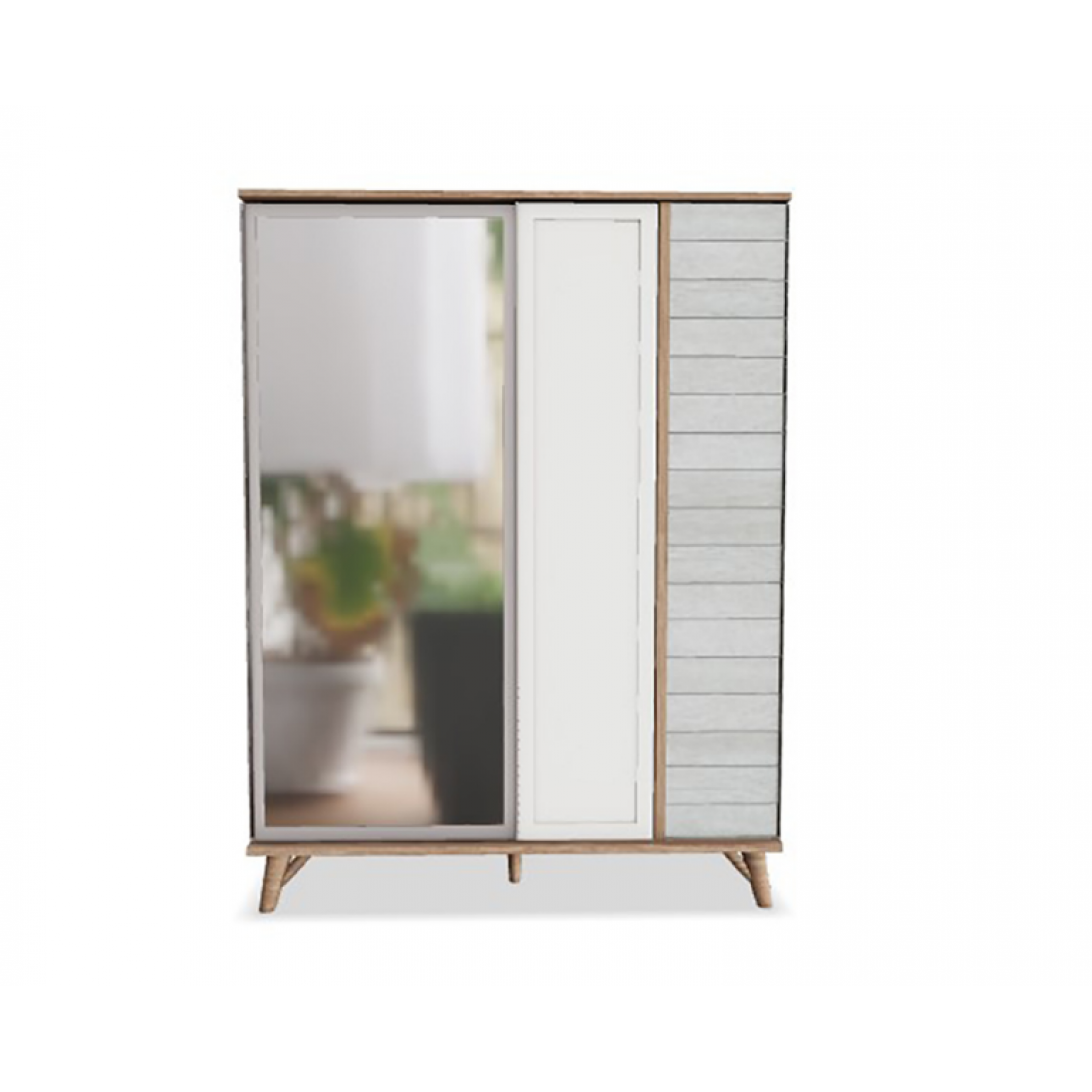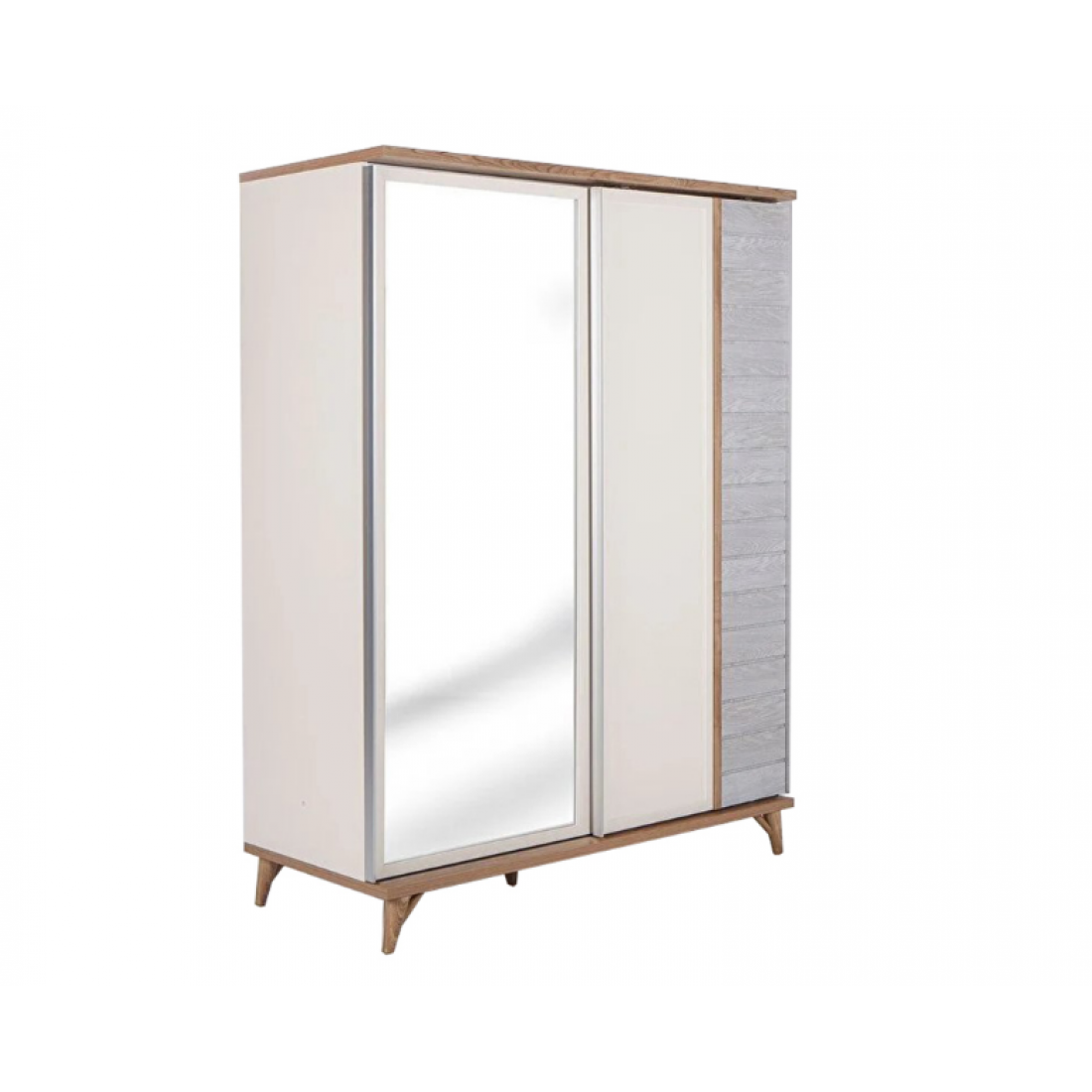 Шкаф-купе платяной шкаф Mavenna изготовлен из высококачественного ЛДСП производства Турция, класс эмиссии формальдегидов Е1. Одна зеркальная дверь, одна- бежевая с серой имитацией деревянных досок. Наполнение шкафа- 2 полки+ штанга в широком отделении слева, штанга и 2 полки с разделителем в широком отделении справа. Двери с доводчиками.