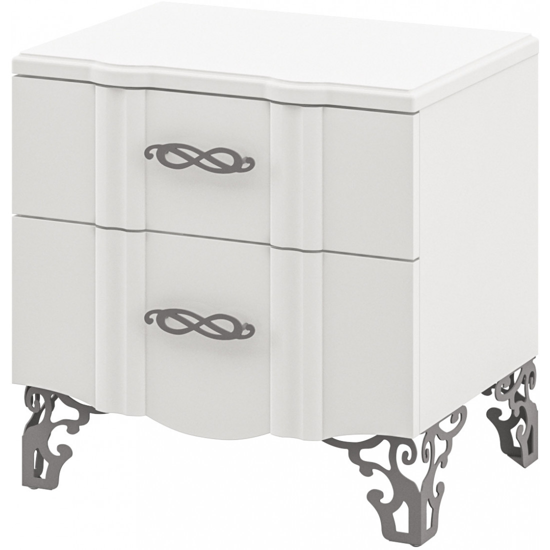 • Спинка кровати с накладными мягкими элементами, облицованными экокожей и по периметру с профильным фрезерованием выполненным методом лазерной обработки с серебряным патинированием.