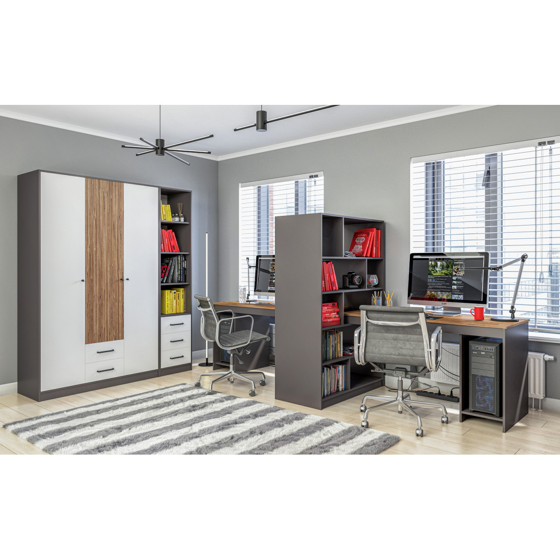 Цветовая палитра коллекции Мальма: белый, графит, Дуб Стирлинг. Спокойные оттенки мебели станут прекрасным фоном для ярких аксессуаров и вещей, помогут избежать лишнего визуального шума в интерьере.