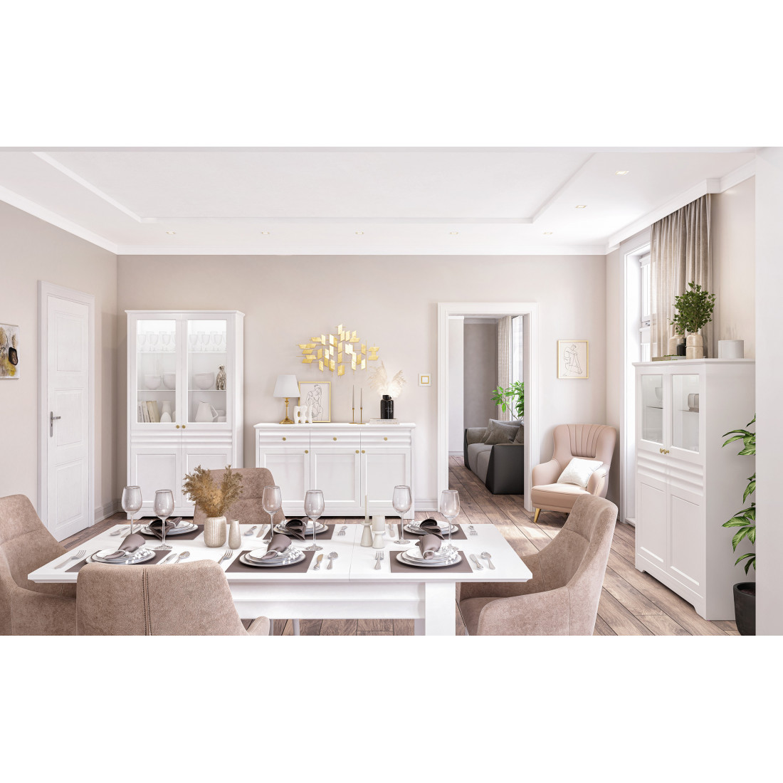 Денвер – это новая коллекция корпусной мебели для спальни, гостиной и столовой. Прямые строгие линии в сочетании с легкой горизонтальной волной на фасадах придают мебели элегантный и уверенный вид. Белый матовый цвет мебели, любимый многими за универсальность, можно сочетать с любым оттенком стен и пола. Округлые металлические золотые ручки разбавляют строгий и лаконичный вид фасадов и добавляют интерьеру утонченности.